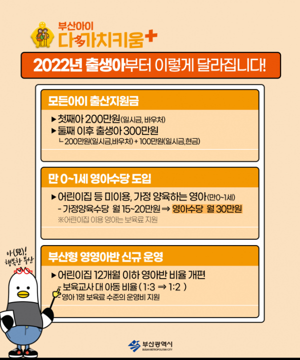 [충청뉴스큐] 부산시는 아이와 부모에게 힘이 되는 행복도시 조성을 위해 내년부터 ‘영아기 집중투자’ 사업을 중점적으로 추진한다고 밝혔다.