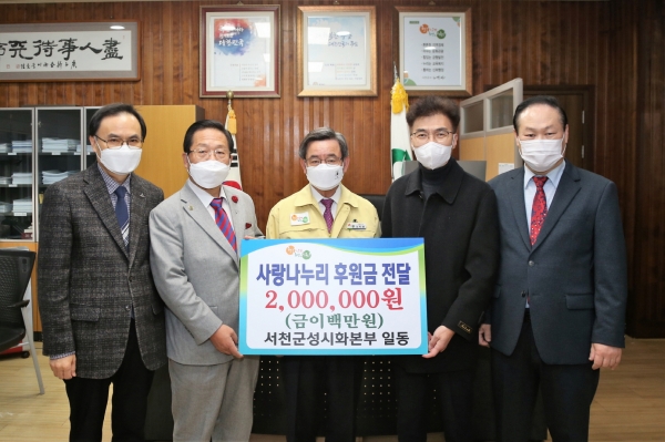 [충청뉴스큐] 서천군은 지난 17일 서천군성시화본부에서 어려운 이웃을 위해 써달라며 사랑나누리 이웃돕기 후원금 200만원과 서천사랑장학회 장학금 100만원을 전달해 왔다고 밝혔다.