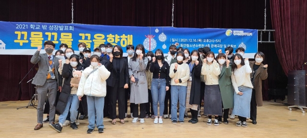 [충청뉴스큐] 안양시청소년재단 산하 학교밖청소년지원센터는 센터 소속 학교밖청소년을 대상으로 지난 16일 동안청소년수련관 문예극장에서 2021 학교 밖 성장발표회 ‘꾸물꾸물, 꿈을향해’를 개최했다.