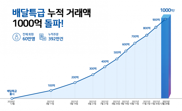 배달특급은 서비스 개시 3개월 만에 누적 거래액 100억원을 돌파한 뒤 올해 5월 14일 200억원 6월 27일 300억원 7월 27일 400억원 8월 26일 500억원 9월 19일 600억원 10월 11일 700억원 11월 7일 800억원 11월 30일 900억원 발판을 밟으며 상승 곡선을 그려왔다.