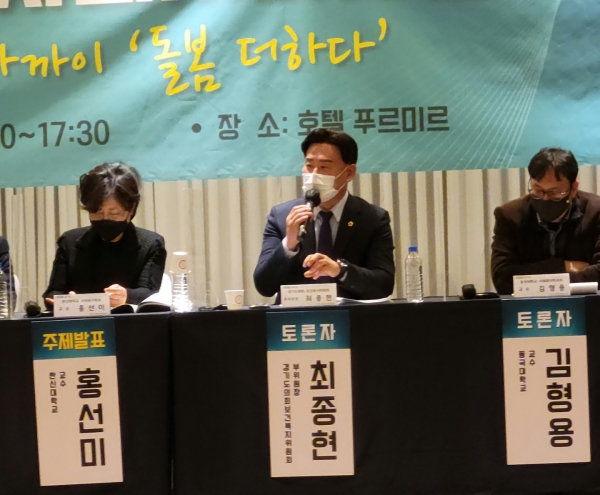 [충청뉴스큐] “사회서비스는 제공 인력의 역량에 따라 서비스 질이 좌우되는 휴먼서비스로서 서비스 품질향상을 위한 종사자 처우개선이 중요한 과제이다”최종현 경기도의원은 20일 화성시 푸르미르 호텔에서 열린 2021 제1차 경기도사회서비스원 포럼 토론자로 참석해 ‘경기도사회서비스원 중장기 발전방안’에 대한 정책대안을 제시했다.