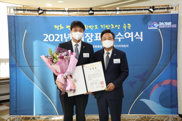[충청뉴스큐] 수원시의회 조석환 의장이 21일 화성시청 대강당에서 열린 ‘민주평화통일자문회의 경기지역 의장표창 수여식’에서 의장 표창을 수상했다.