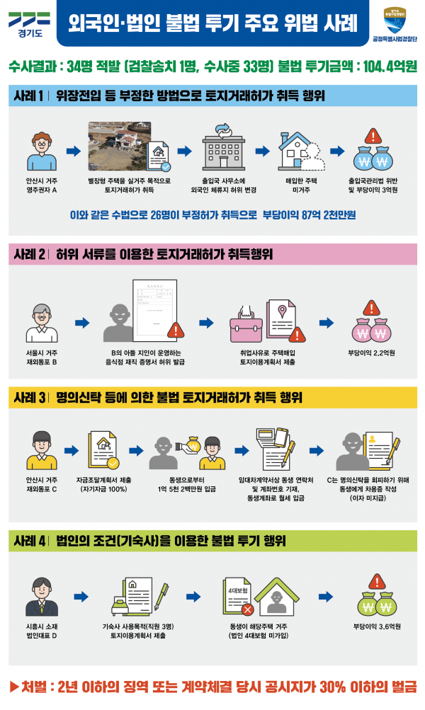 [충청뉴스큐] 토지거래허가 구역 내에서 위장전입, 명의신탁 등 부정한 방법으로 104억원 규모의 불법 투기행위를 벌인 재중동포 등 외국인과 법인 34명이 경기도 특사경에 적발됐다.