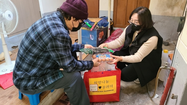 희망나눔꾸러미는 장항읍 ‘좋은이웃’의 후원금으로 마련되며 코로나19로 반찬 나눔과 단체급식 등 식사 지원 중단으로 어려움을 겪고 있는 30가정을 방문, 제철 식재료로 구성된 꾸러미를 전달하고 안부를 살피는 사업이다.