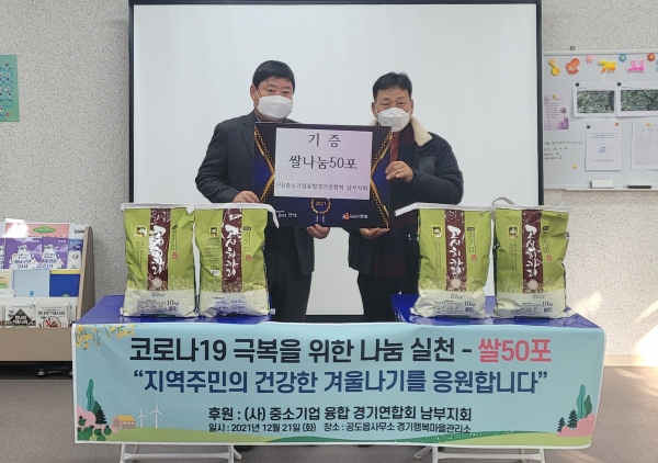 [충청뉴스큐] 중소기업융합경기연합회 남부지회는 지난 21일 코로나19 장기화로 어려움이 큰 저소득층을 위한 백미 50포를 안성시 공도읍에 기탁했다.