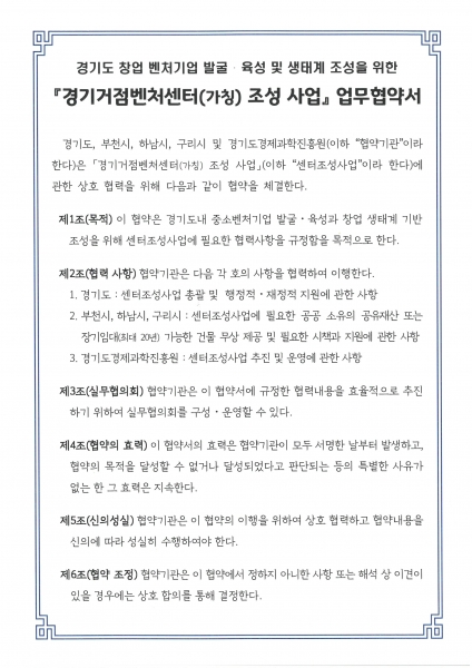 협약의 주요 내용은 경기거점벤처센터 조성·운영을 위한 예산·인력·행정지원, 공공 소유 공유재산 또는 장기임대 가능한 건물 무상 제공 및 시책지원, 센터 조성사업 추진 및 운영에 관한 사항 등이다.
