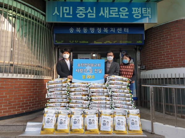 [충청뉴스큐] 송탄한마음교회에서 성탄절을 맞아 지난 21일 도움의 손길이 필요한 이웃들에게 전하고자 평택시 송북동행정복지센터에 ‘사랑의 쌀’ 50포를 후원했다.