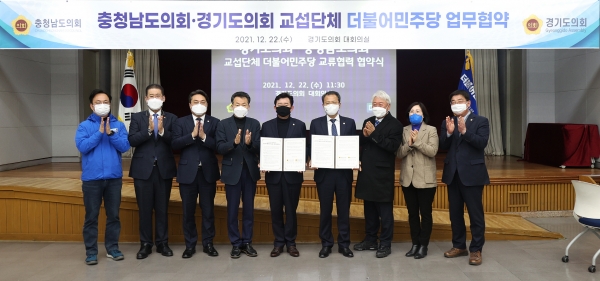[충청뉴스큐] 경기도의회 교섭단체 더불어민주당은 충청남도의회 교섭단체 더불어민주당과 22일 경기도의회 대회의실에서‘경기도의회-충청남도의회 교섭단체 더불어민주당 교류·협력 협약식’을 개최했다.