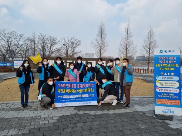 [충청뉴스큐] 평택시는 지난 20일 반려동물을 키우는 가정과 공원 및 산책로 등에서 반려동물을 둘러싼 갈등이 증가함에 따라 성숙한 반려동물 문화 조성을 위해 배다리생태공원에서 펫티켓 캠페인을 실시했다.