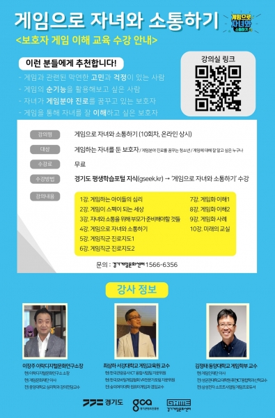 청소년에게 단순한 놀이를 넘어 사회화의 주요한 매개가 되고 있는 게임을 통해 자녀와 가까워지고 싶은 보호자는 ‘경기도 평생학습포털 지식’에서 언제든지 무료로 강의를 수강할 수 있다.