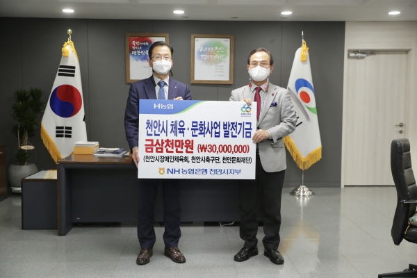 기부금은 농협이 지정한 대로 천안시장애인체육회와 천안시축구단, 천안시문화재단에 전달돼 체육과 문화 분야 발전을 위해 사용될 예정이다.