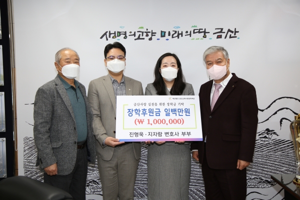 [충청뉴스큐] 진형욱·지자람 변호사 부부는 지난 24일 금산군청을 방문해 100만원의 장학금을 금산교육사랑장학재단에 기탁했다.