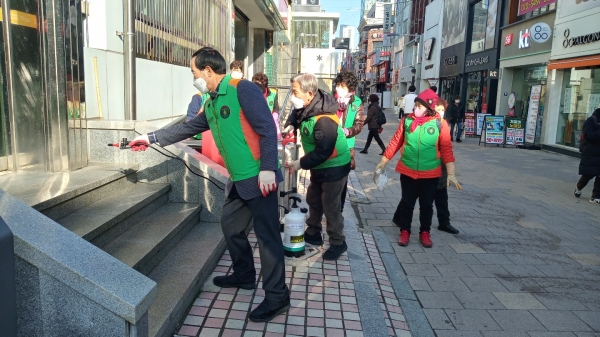 [충청뉴스큐] 청주시 지역자율방재단음 연말연시를 맞아 코로나19 확산을 방지하고자 지역 내 번화가를 대상으로 방역 작업을 실시하고 있다.