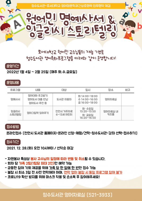 [충청뉴스큐] 천안시 청수도서관은 지난 2월 체결한 호서대학교 영어영문학과와의 업무협약을 통해 2022년에도 원어민 교수진 재능기부 프로그램을 운영한다고 28일 밝혔다.