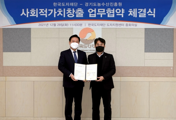 [충청뉴스큐] 한국도자재단과 경기도농수산진흥원이 28일 재단 도자지원센터에서 경기도 도자문화 확산과 농수산물 소비 촉진을 위한 ‘사회적 가치 창출’ 업무협약을 체결했다.