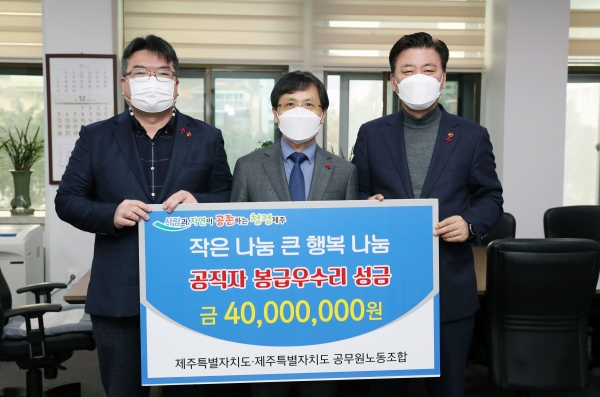 구만섭 제주특별자치도지사 권한대행은 28일 오전 11시 집무실에서 제주도 공무원노동조합 오태권 위원장과 함께 봉급우수리 모금으로 마련된 성금 4,000만원을 지정 기탁으로 제주도 사회복지공동모금회 강지언 회장에게 전달했다.