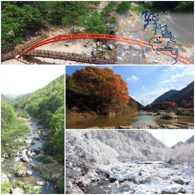 금천 계곡을 따라 작년에 조성된 치유의 숲은 3.1㎞의 산책로와 더불어 편백나무로 이뤄진 치유정원, 목교, 파고라, 전망대, 소원바위 등이 있어 가볍게 산책하기에 지루하지 않고, 곳곳에 박혀있는 이 지역 출신인 정지용시인의 시 팻말로 감성적 테마가 조화를 이룬다.