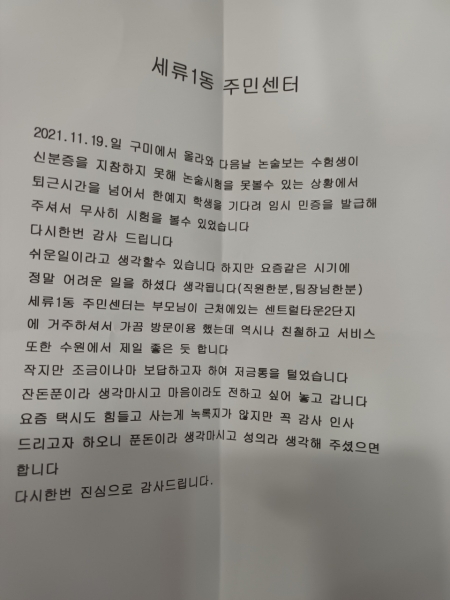 김태형 주무관은 “재발급이 꼭 필요한 상황이라고 판단해 흔쾌히 ‘기다리겠다’고 했다”며 “한예지양이 무사히 시험을 치러서 다행”이라고 말했다.