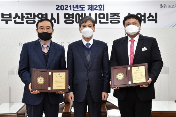 [충청뉴스큐] 부산시는 부산의 발전을 위해 헌신적으로 노력한 변수남 전 부산시 소방재난본부장과 왕의립 씨를 2021년도 하반기 명예시민으로 선정하고 지난 29일 명예시민증을 수여했다고 밝혔다.