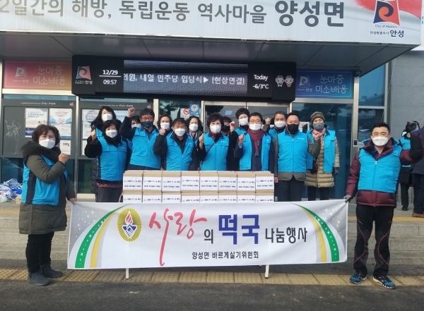 [충청뉴스큐] 안성시 양성면 남녀바르게살기위원회는 지난 29일 양성면사무소에서 회원 10여명이 참여한 가운데 이웃돕기 ‘사랑의 떡국떡 나누기 행사’를 진행했다.