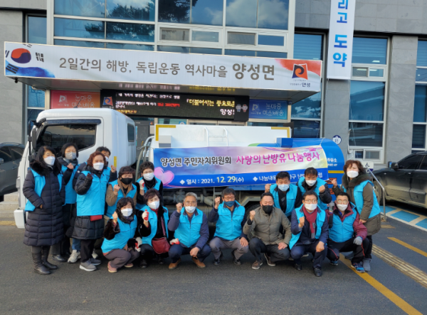 최근 코로나19로 모두가 어려운 여건 속에 예년에 비해 나눔의 손길이 줄어든 상황에서 우리 주변의 복지 사각지대에 놓인 소외되고 어려운 이웃을 돕기 위해 양성면 주민자치위원회는 난방유 2000리터를 양성면 관내 어려운 이웃 10가구에 각각 200리터씩 전달하며 이들이 따뜻한 겨울을 보낼 수 있도록 힘을 보탰다.