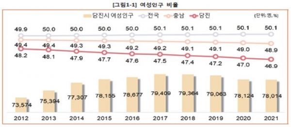 통계자료에 따르면 2021년 5월 말 기준, 당진시 여성인구는 7만8014명으로 전체 인구 16만6491명 중 46.9%를 차치해 2018년, 2019년, 2020년 대비 소폭 감소한 것으로 나타났다.