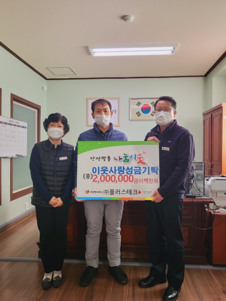 [충청뉴스큐] 안성시 미양면에 소재한 ㈜플러스테크가 동절기를 맞아 관내 저소득계층에 희망을 전하기 위해 지난 30일 미양면사무소에 성금 200만원을 기탁했다.