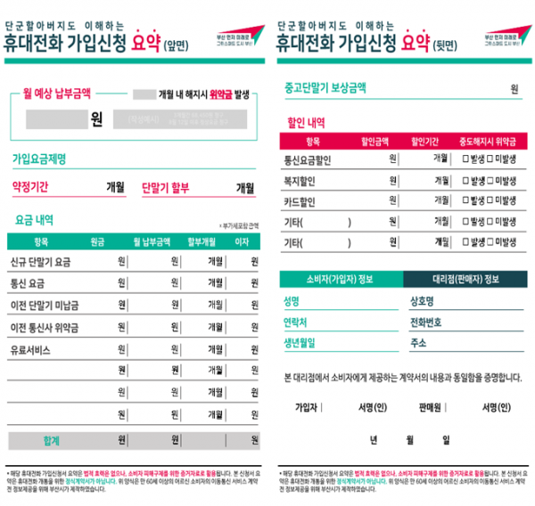 계약서 핵심 내용을 요약한 요약서를 큰 글씨로 이해하기 쉬운 용어를 사용해 작성해 고령자들의 휴대전화 가입내용을 쉽게 인지하게 하겠다는 목적이다.