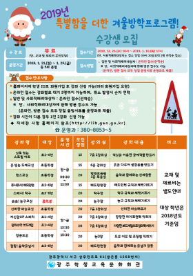 [충청뉴스큐] 광주학생교육문화회관은 2019년 겨울방학을 맞아 초·중학생을 위한 "특별함을 더한 겨울방학프로그램"을 실시한다.