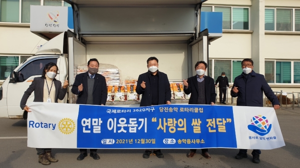 [충청뉴스큐] 국제로타리 3620지구 당진송악 로타리클럽은 최근 관내 어려운 이웃을 위해 써 달라며 쌀 100포를 송악읍 행정복지센터에 전달했다.