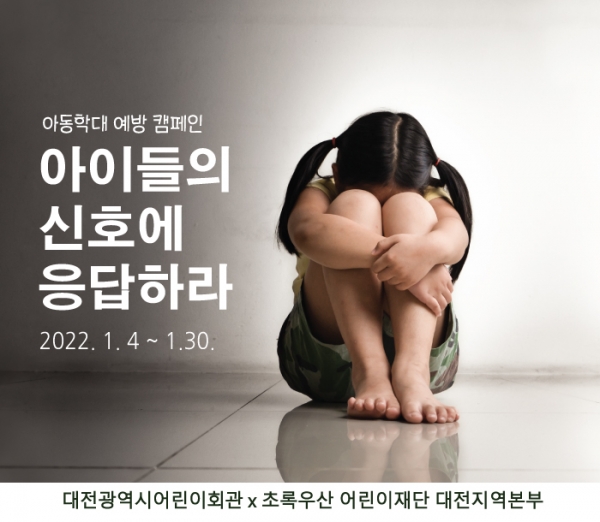 [충청뉴스큐] 대전시는 대전어린이회관, 초록우산어린이재단 대전지역본부와 함께 1월 4일부터 1월 30일까지 어린이회관 사계절상상놀이터 로비에서 아동학대 예방 캠페인 ‘아이들의 신호에 응답하라’를 진행한다고 밝혔다.