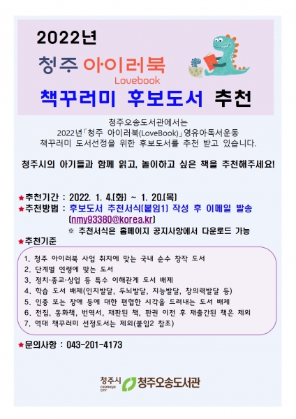[충청뉴스큐] 청주오송도서관은 아기와 부모가 함께 책을 읽는 즐거움을 통해 평생 독서를 실천할 수 있는 ‘청주 아이러북’ 영유아독서운동의 책꾸러미 후보도서를 오는 20일까지 추천받는다.