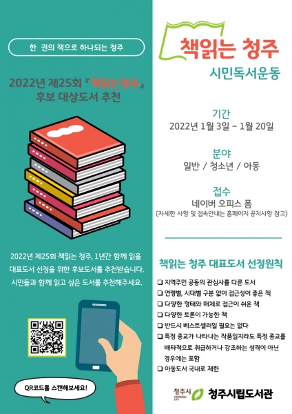 [충청뉴스큐] 청주시립도서관이 책을 통해 시민과 소통하고 공감하기 위한 2022년 책읽는청주 시민독서운동 후보도서를 오는 1월 20일까지 추천받는다.