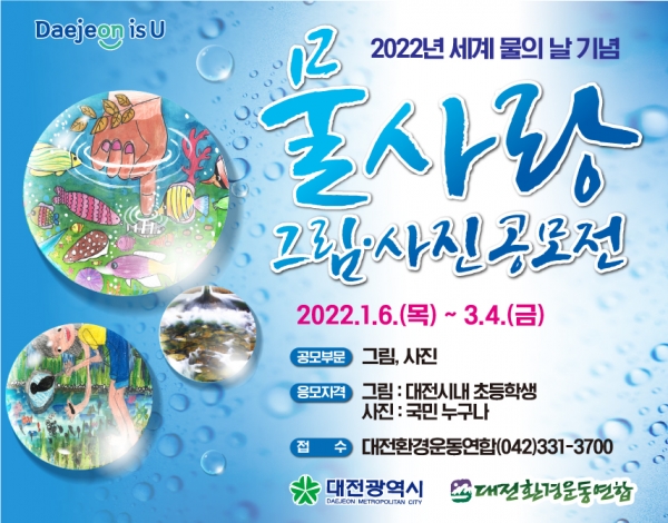 [충청뉴스큐] 대전시와 대전환경운동연합은 오는 3월 22일 ‘세계 물의 날’을 앞두고 ‘지하수 : 보이지 않는 물을 보이게 하자’라는 주제로 오는 3월 4일까지 ‘2022 물사랑 그림 · 사진 공모전’을 개최한다고 6일 밝혔다.