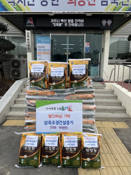 [충청뉴스큐]지난 1월 5일 박명현 삼죽조경건설중기 대표가 이웃돕기 물품으로 쌀 10kg 100포를 안성시 삼죽면사무소에 기부했다.