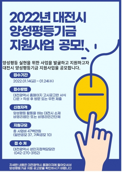 [충청뉴스큐] 대전시는 양성평등 촉진과 여성의 권익 증진을 위한‘2022년도 양성평등기금 지원 사업’을 공모한다고 밝혔다.