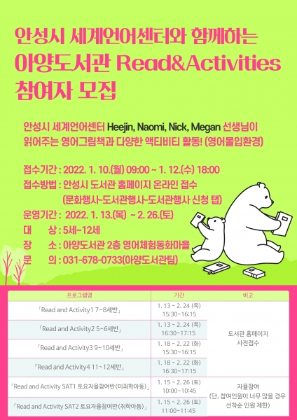 [충청뉴스큐] 안성시 아양도서관에서는 오는 1월 10일 월요일부터 5세~12세를 대상으로 Read and Activities 영어그림책방 참여자를 모집한다.