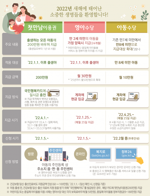 2022년 출생아부터 가정에서 양육하는 아동은 두 돌 전까지 기존 가정양육수당 대신 ‘영아수당’을 받게 된다.