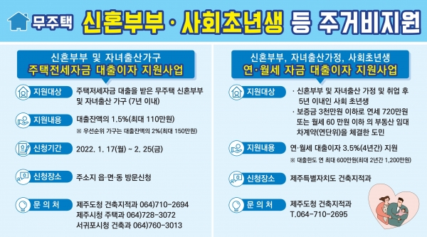 [충청뉴스큐] 제주특별자치도는 코로나19 장기화로 주거비 부담을 겪는 도민을 돕기 위해 세대별·계층별 맞춤 대출이자 지원 사업을 시행한다.