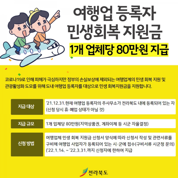 [충청뉴스큐] 전라북도가 코로나19 장기화로 어려움을 겪는 여행업계에 힘을 싣어 주고자 민생회복 지원금을 지급한다.
