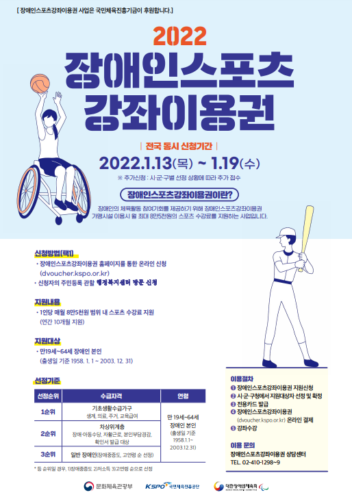 장애인 스포츠강좌 이용권은 장애인의 건전한 여가활동을 위해 월 최대 8만 5천 원의 스포츠강좌 수강료를 지원하는 사업이다.