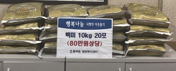 지난 11일 오전 통복동행정복지센터에 찾아와 “어려운 이웃을 돕고 싶다”며 폐지를 주워 한푼 두푼 모아 구입한 쌀 20포를 기탁한 익명의 독지가는 본인의 이름을 밝히기 거부하며 매년 어려운 이웃을 위해 10년째 기부를 하고 있다.