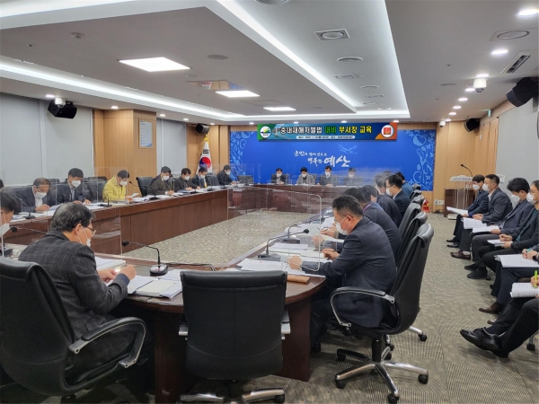 [충청뉴스큐] 예산군은 지난 10일 군청 중회의실에서 단체장 및 부서장을 대상으로 중대재해처벌법 대비 관리자 교육을 선제 실시했다.