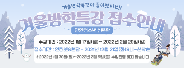 박영미 만안청소년수련관장은 “겨울방학을 맞은 청소년들이 안전한 환경 속에서 특별한 활동을 할 수 있도록 유익하고 흥미로운 강좌들을 개설했으니 많은 관심과 참여를 바란다”고 말했다.