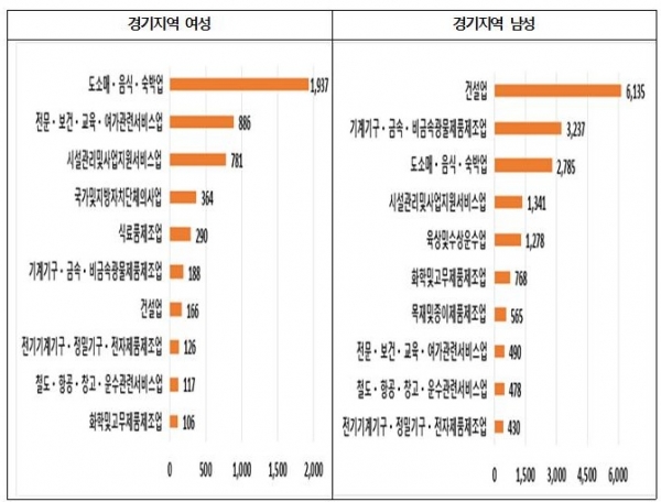 성별 산업재해 업종 비율을 보면 여성은 도소매·음식·숙박업 보건·교육 등 시설관리 및 지원서비스업 등의 순이고 남성은 건설업 기계기구·비금속·금속제품 제조업 도소매·음식·숙박업 등의 순이다.