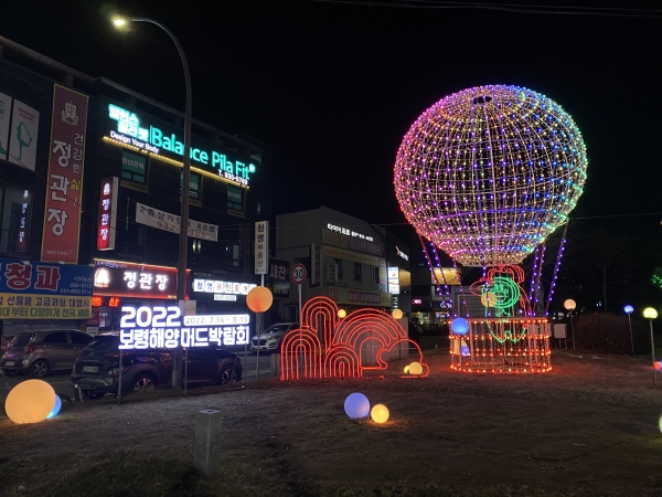 2022보령해양머드박람회 대표 캐릭터와 별, 열기구 등으로 조성된 야간경관 조명은 반짝거리는 불빛을 이용한 시각적인 즐거움과 아름다움을 선사하고 있다.