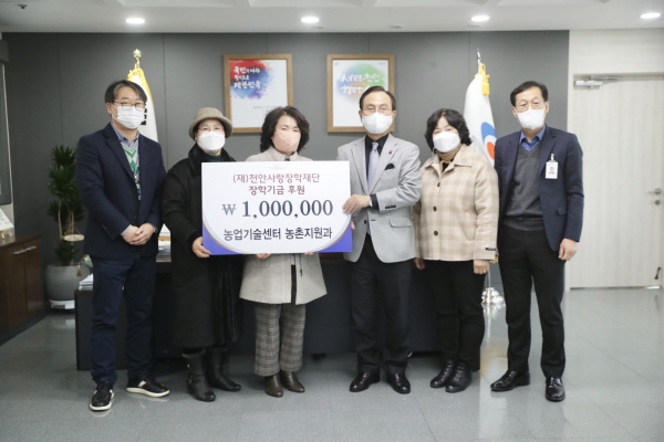 [충청뉴스큐] 농촌지도자천안시연합회(회장 안종근)과 생활개선천안시연합회(회장 임대선), 농업기술센터 농촌지원과가 지난 12일 지역인재 육성과 어려운 학생들을 위해 각 100만원씩 총 300만원을 천안사랑장학재단(이사장 박상돈)에 기부했다.