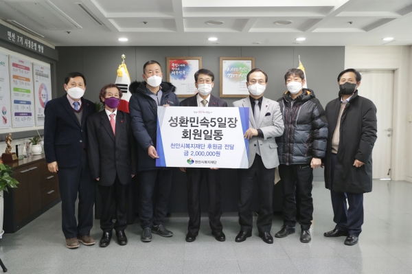 [충청뉴스큐] 천안 성환민속5일장 회원 일동이 지난 12일 천안시청 시장실에서 관내 취약계층 지원을 위한 후원금 200만원을 천안시복지재단에 전달했다.