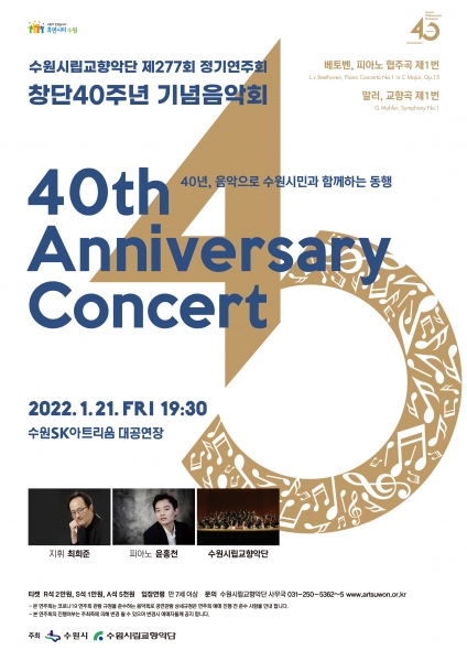 [충청뉴스큐] 2022년 창단 40주년을 맞은 수원시립교향악단이 1월 21일 오후 7시 30분 수원SK아트리움 대공연장에서 기념음악회를 개최한다.