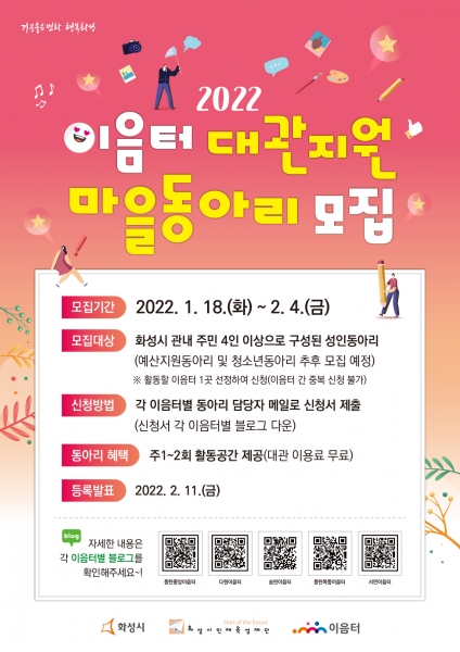 대관지원형 마을동아리는 화성시에 거주하는 시민 4인 이상으로 구성된 동아리면 누구나 신청할 수 있으며 모집 관련 세부 내용은 각 이음터 네이버 블로그를 통해 확인할 수 있다.